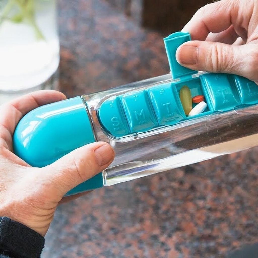 Non un semplice porta pillole o integrartori ma una vera bottiglia con tappo a bicchiere e tutto lo spazio per ospitare le tue pillole settimanali. Ottima soluzione per avere le tue pillole in viaggio, a lavoro e ovunque tu sia, sempre divise per giorno della settimana e con l'acqua pronta.