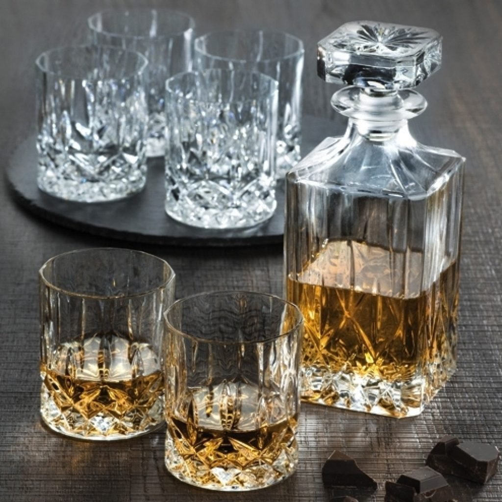 Bevitore di whiskey o scotch, non importa in questo caso: una bella bottiglia in vetro con bicchieri annessi è sempre un ottimo regalo da ricevere. Un accessorio perfetto per ogni salotto da bevitore.