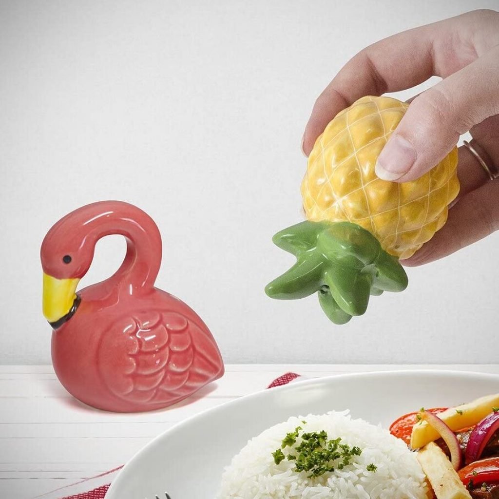 Vuoi che il tuo set sale e pepe ti faccia viaggiare e ricordare posti lontani e tropicali? Ecco il sale e pepe per te! Un ananas e un fenicottero sulla tua tavola per insaporire i tuoi piatti.