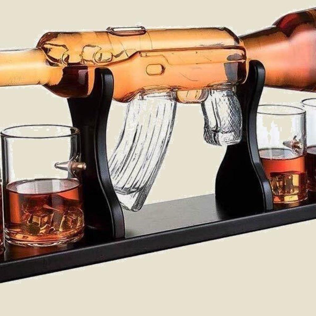 Se non riesci a trovare una bottiglia perfetta per il tuo letale whisky preferito, potresti dover smettere di cercare. Questa bottiglia decanter in vetro a forma di AK47 e un set letale per il tuo whisky. Base in legno, decanter realizzato in vetro soffiato e bicchieri con proiettili incastonati.