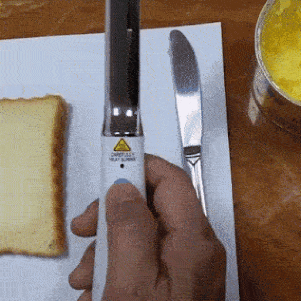 Stufo di dover grattare il burro freddo di frigo con il coltello, per poi cercare di spalmarlo sul pane con scarso successo? Arriva il coltello riscaldato spalma burro. Cosa c'è di meglio di una lama calda per tagliare e spalmare il burro sul pane?