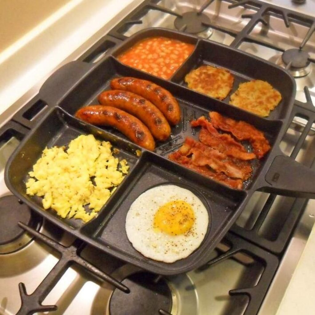 Quando ti cucini il brunch e metti sui fornelli più di una padella, stai già sbagliando tutto…. Eleva la tua colazione con questa padella "Master Pan" a scomparti multipli per cucinare simultaneamente, uova, pancetta, salsicce, fagioli, verdure grigliate e qualsiasi altra cosa tu voglia metterci sopra.