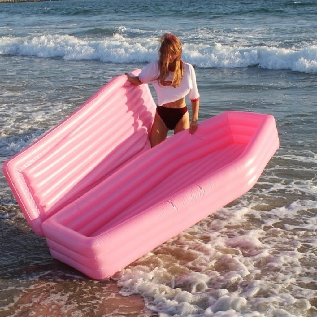 Quando sei al mare e sul tuo materassino ti lasci trasportare dalle onde, non vuoi di certo essere importunata dal marpione di turno che cerca di attaccare bottone. Ecco quindi il materassino bara: potrai galleggiare indisturbata… per sempre!