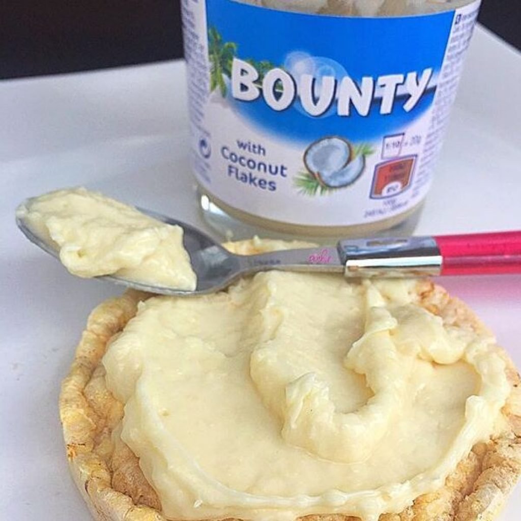 Ami il bounty e quindi il dolce sapore e la consistenza granulosa del cocco legato al latte? Prova ad assaggiare questa crema spalmabile fatta solo con il ripieno del bounty, ovvero crema al latte con fiocchi di cocco. Barattolo, cucchiaino e divano, e nessun rimorso (almeno fino alla fine del barattolo).