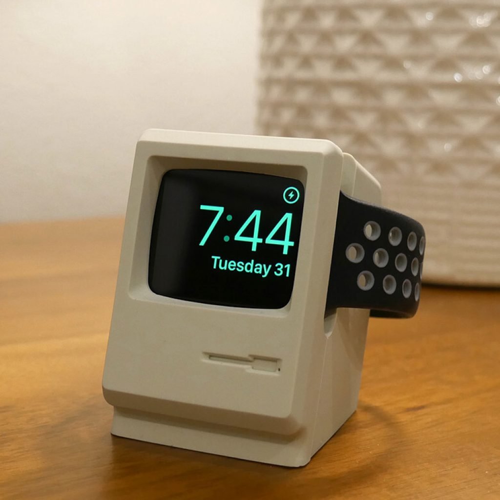 Questo stand in silicone per apple watch, modellato sulle forme di un Macintosh del 1984, è il tocco di classe che ogni fan della mela morsicata dovrebbe avere sul suo comodino.
