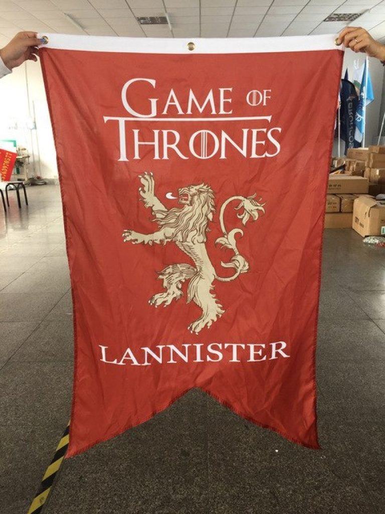 Appendi sulle tue mura lo stemma di casa Lannister, leone dorato in campo cremisi. Protettori dell'Ovest, proprietari dei ricchi giacimenti auriferi di Lannisport con roccaforte a Castel Granito. Anche tu potrai trasmettere il loro motto "Udite il mio ruggito!", e ovviamente pagare sempre i tuoi debiti!