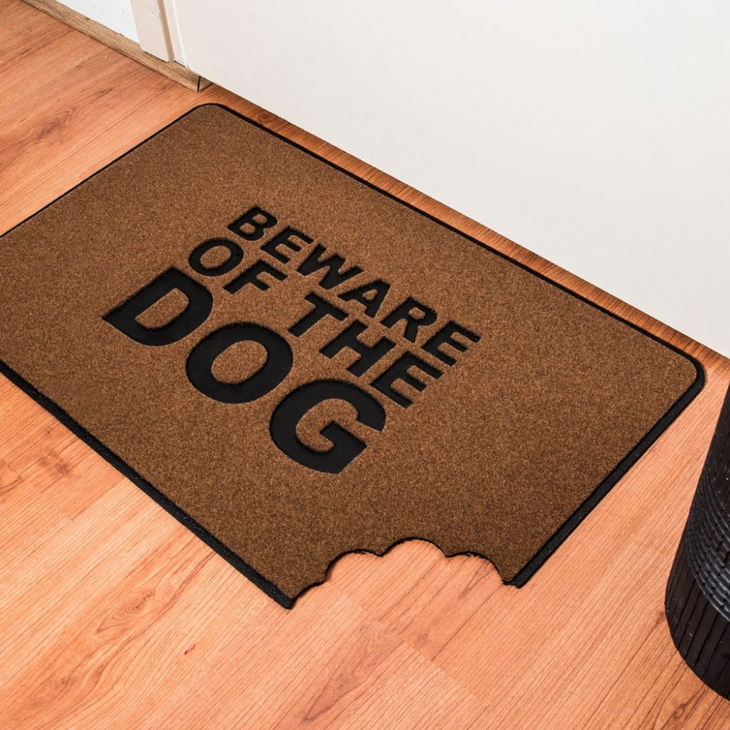 Rendi nota a tutti i tuoi ospiti, e non solo a loro, la presenza del tuo cane con questo curioso zerbino. La scritta intima di stare attenti al cane, mentre il morso non lascia alcun dubbio sulla ferocia del vostro cucciolo.