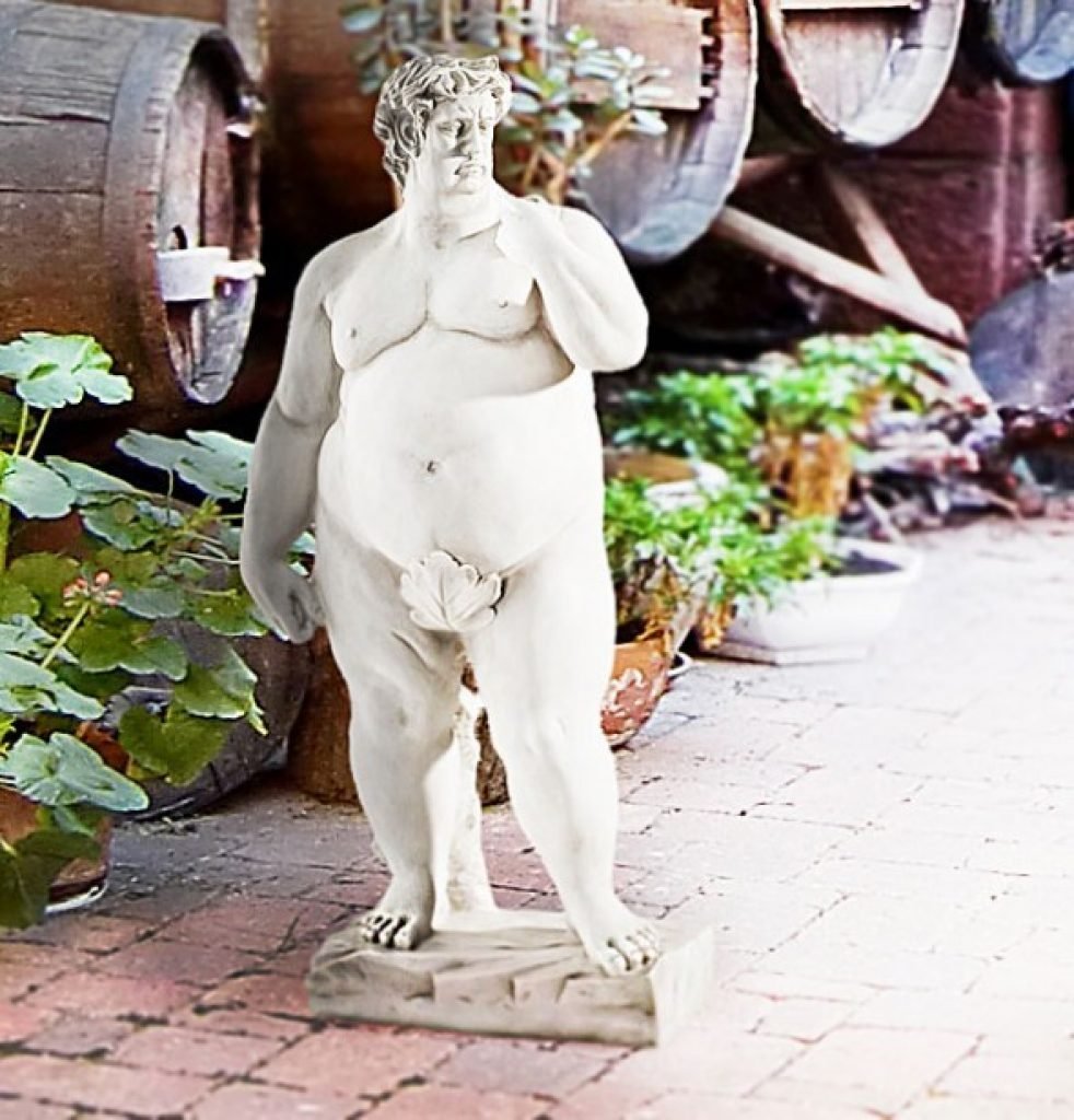 Abbelisci il tuo giardino con un tocco di humor e stile classico con questa statuetta del David di Michelangelo in versione sovrappeso. Realizzata in resina e pietra e dipinto a mano, è una piccola opera d'arte irriverente di 76 centimetri di altezza, perfetta da sfoggiare nel tuo giardino e incuriosire i tuoi ospiti.