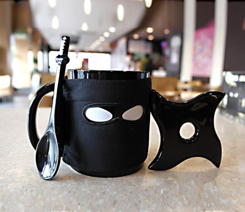 Goditi il tuo prossimo caffè in questa tazza Ninja nera come la notte. La tazza è rivestita di materiale termico per impugnarla anche quando il caffè al suo interno è incandescente, il piattino è una stella ninja e il cucchiaino a forma di Katana.